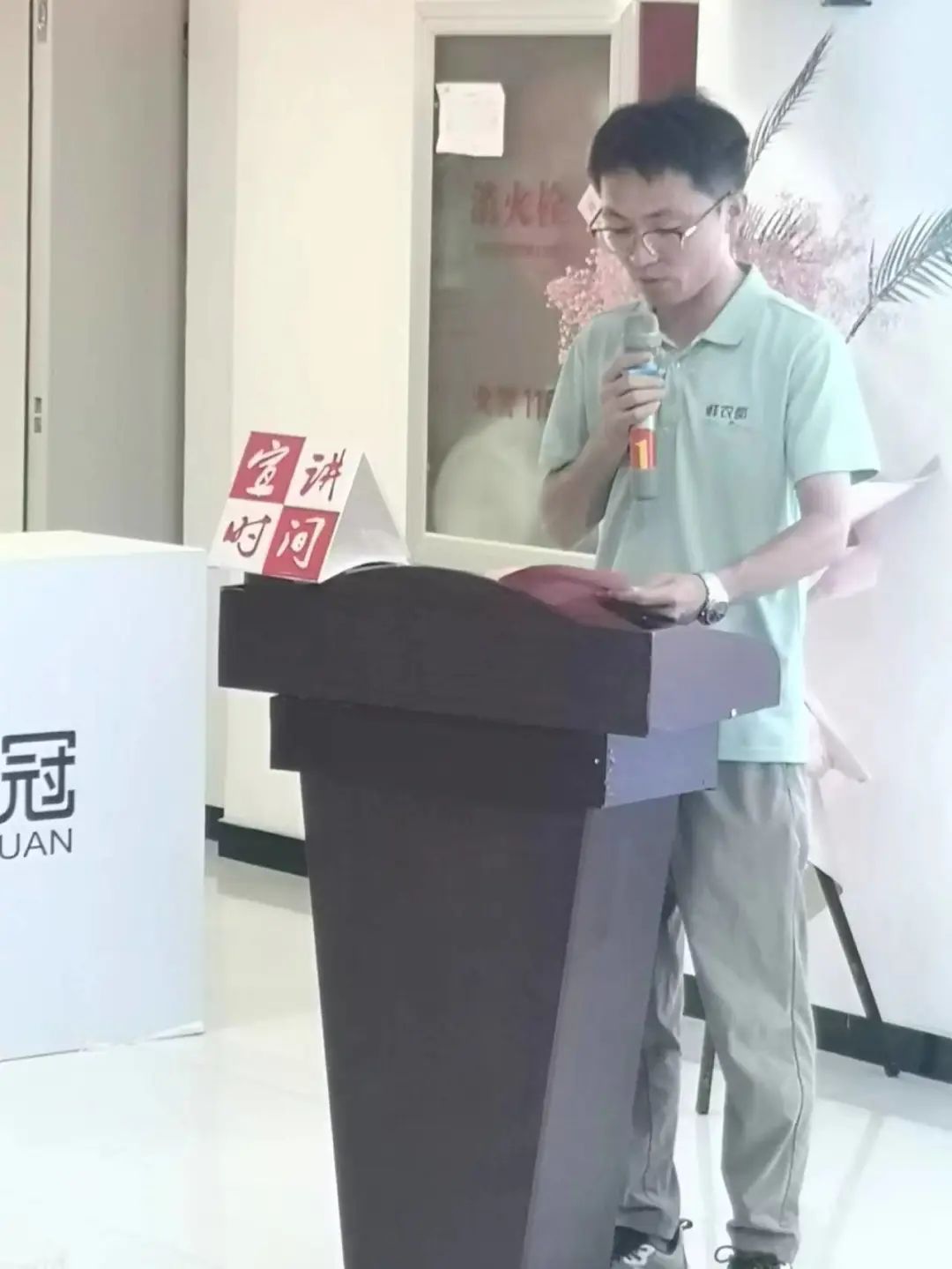 接下来,在公司大厅举行了简短而隆重的欢迎仪式,活动由济宁市读书协会杨子主持。首先嘉祥鲜农都市场管理有限公司负责人李振鹏致欢迎词,并对济宁市读书协会书画家一行来公司参观指导表示热烈的欢迎和衷心的感谢。随后,嘉祥县农业农村局一级主任科员王悦启、嘉祥县文化和旅游局文化执法大队副大队长张建华、济宁市读书协会副会长朱继德等先后致辞,对嘉祥鲜农都市场管理有限公司近年来取得的成就给予充分的肯定和积极的赞赏,对这次书画惠企活动充满了期待。而后,济宁市读书协会名誉会长曹明祥就《推进农业现代化建设》这一主题,从中国农业现代化的目标、差距和行动路径以及保护我们的粮食和食品安全等几个方面作了深入浅出的讲解分析和精彩的理论宣讲。嘉祥县图书馆馆长任宪俊、副馆长刘爱玲以及公司员工20余人参加了本次活动。